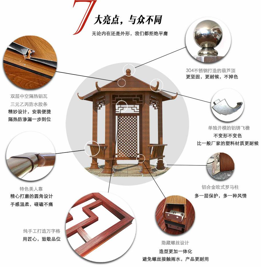星空体育·星空官方网站-星空online(中国)凉亭系列产品是采用高强度铝合金为原材料,经酸洗铬化,电泳或静电喷涂,木纹转印处理后,精密定制设计,保障安装。它具有防水防潮,不膨胀不变形,防腐蚀,具有逼真的木质感。成为别墅住宅及市政园林等建筑美丽的风景。